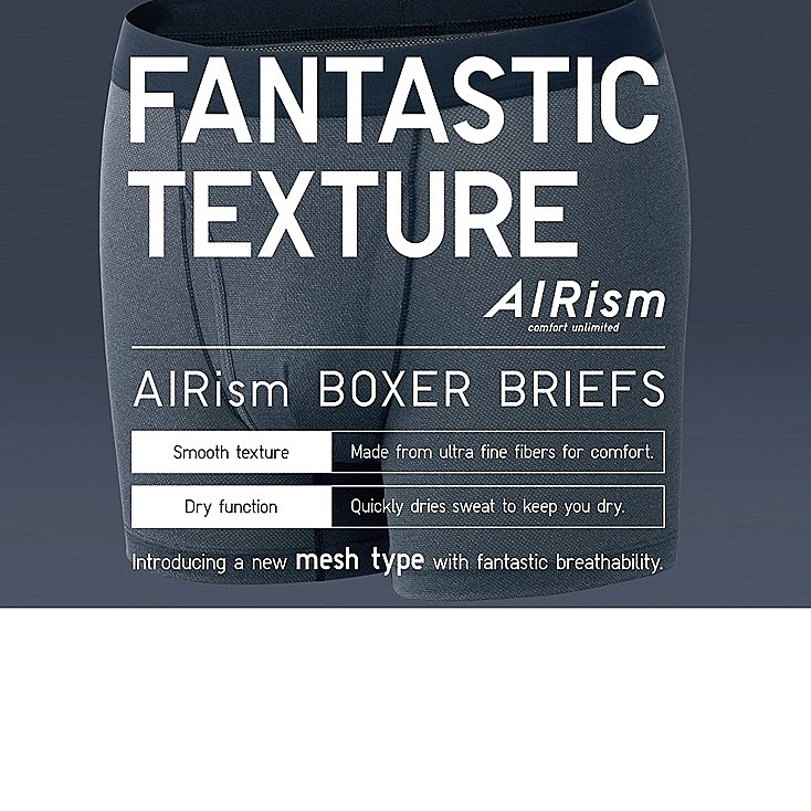 Quần sịp nam với công nghệ AiRism mới nhất của Uniqlo: sử dụng sợi vải siêu mịn nên có khả năng thấm hút mồ hôi, dễ dàng làm khô nhanh, ngoài ra còn có tác dụng khử mùi kháng khuẩn tuyệt vời. Sản phẩm AIRISM được sản xuất phù hợp với da của tất cả mọi người, đem lại cảm giác mát lạnh vào mùa hè.