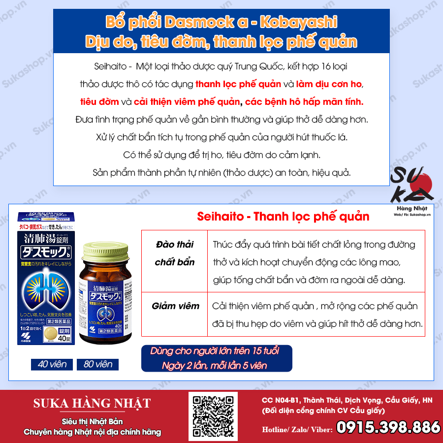 "THUỐC BỔ PHỔI NHẬT BẢN KOBAYASHI " là một toa thuốc của thời nhà Minh, là một toa thuốc với sự kết hợp của 16 loại thảo dược. Hỗ trợ điều trị bệnh đường hô hấp mãn tính và đờm nhớt mạnh