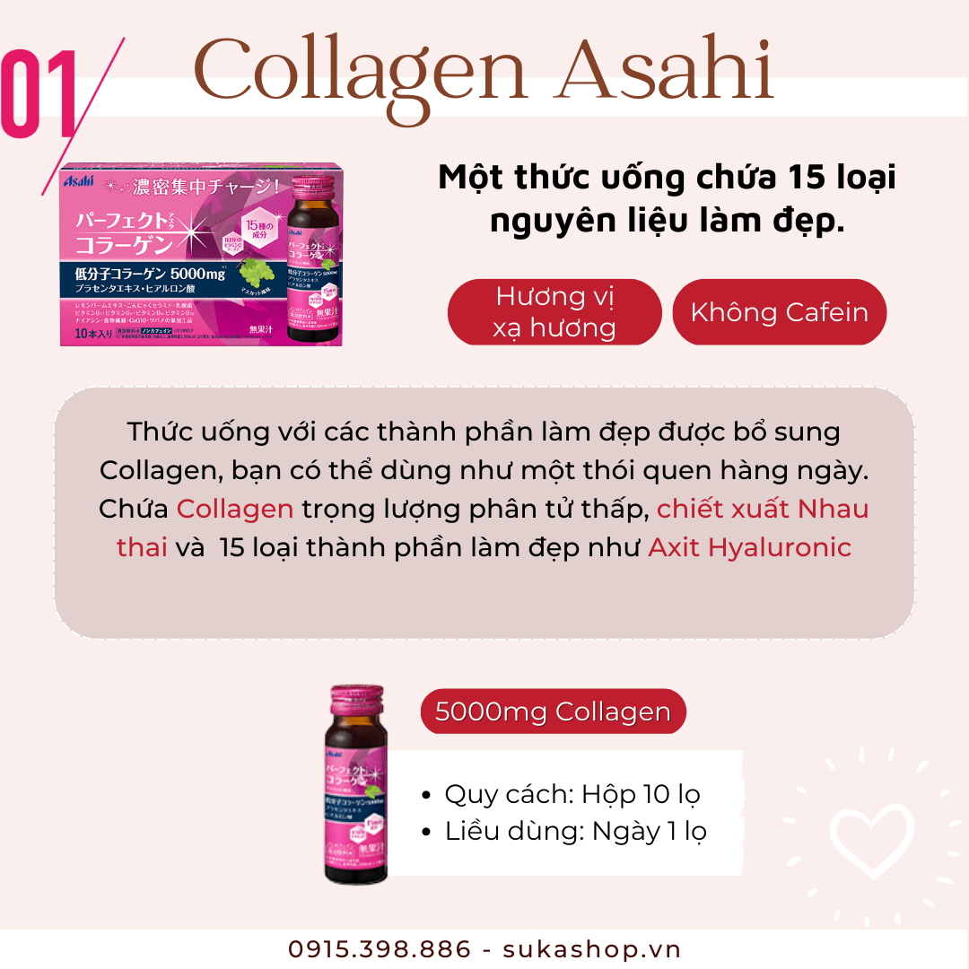 Một trong những loại thực phẩm bổ sung Collagen hiệu quả có thể kể đến Collagen dạng nước "Asta Collagen Perfect" của hãng Asahi Nhật Bản.