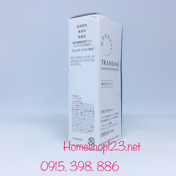 - Kem chông nắng Transino whitening day protector SPF 35 PA +++ là một sản phẩm rất hiệu quả trong việc làm đẹp làn da của bạn. Ngoài việc nuôi dưỡng da, mang lại sự mịn màng cho da, kem trắng da và chống nắng Transino còn làm cho làn da của bạn dần dần trắng sáng như ngọc và đặc biệt không bắt nắng. Sản phẩm có thể dùng làm kem lót trang điểm.